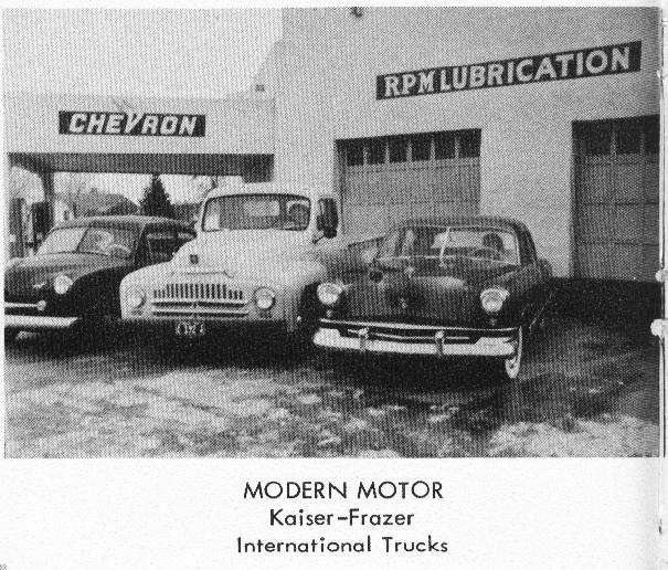 When WWII ended there was a pent up demand for new cars.  Kaiser-Frazer Corporation, a new startup company, was one of the first to start delivering.  My father purchased a new 1947 Frazer to replace the old family 1941 Chevrolet.  It was gold color and looked like a box, was built like a tank, and was a good sturdy car with a lot of comfortable room inside.  Then in 1951 the new sleek restyled Kaiser was introduced and the  Frazer was traded in for a black 1951 Kaiser 2 door Sedan Deluxe.   It was purchased from Modern Motors in Salmon, Idaho and appears on the right in the photo below that was copied from my 1951 Salmon High School yearbook.  The building still exists at the intersection of Hwy 26 and Hwy 28.